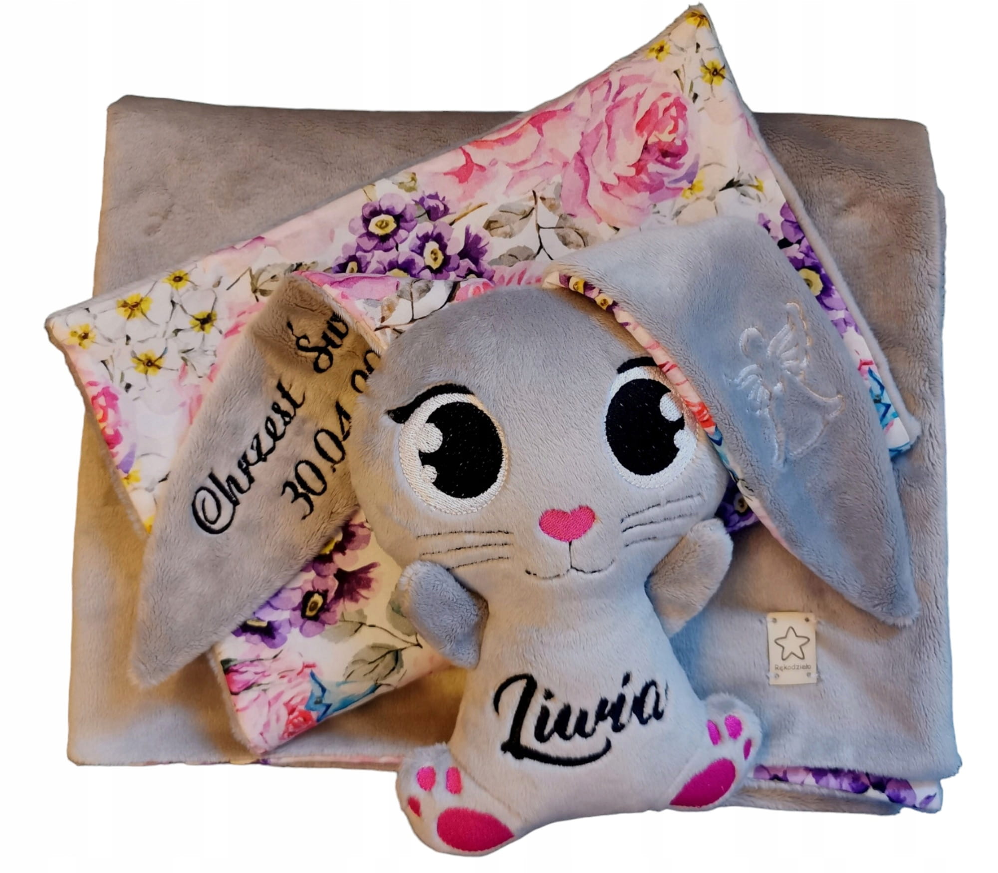 Króliczek jest szyty na zamówienie dla Ciebie z dowolnym imieniem, metryczką, symbolami, znakami zodiaku...