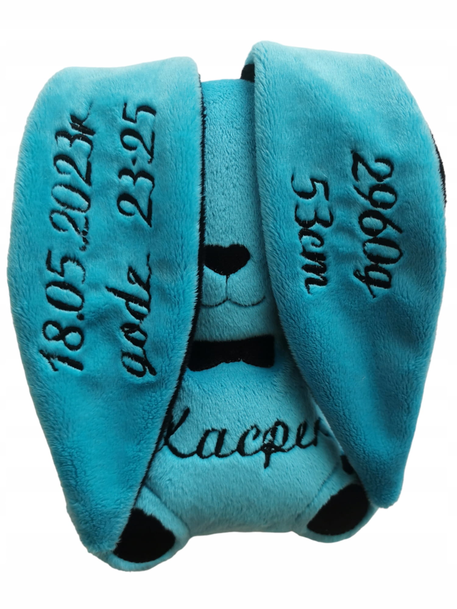 Nasz spersonalizowany pluszowy króliczek to nie tylko urocza zabawka, ale także pamiątka na całe życie. Dodatkowo oferujemy możliwość umieszczenia na pluszaku metryczki, na której można umieścić ważne informacje, takie jak data urodzenia dziecka, jego waga i wzrost. Zamiast metryczki, na życzenie, możemy również wyhaftować tam dowolny napis, np. "Dla ukochanej wnuczki", "Kochamy Was - rodzice", "Jeśli tęsknisz, przytul króliczka", na życzenie możemy również wyhaftować serduszko, znak zodiaku, jeśli nie masz pomysłu skontaktuj się z nami, postaramy się pomóc i uszyć króliczka takiego, jakiego sobie wymarzysz. Niech to będzie nasze wspólne dzieło <3