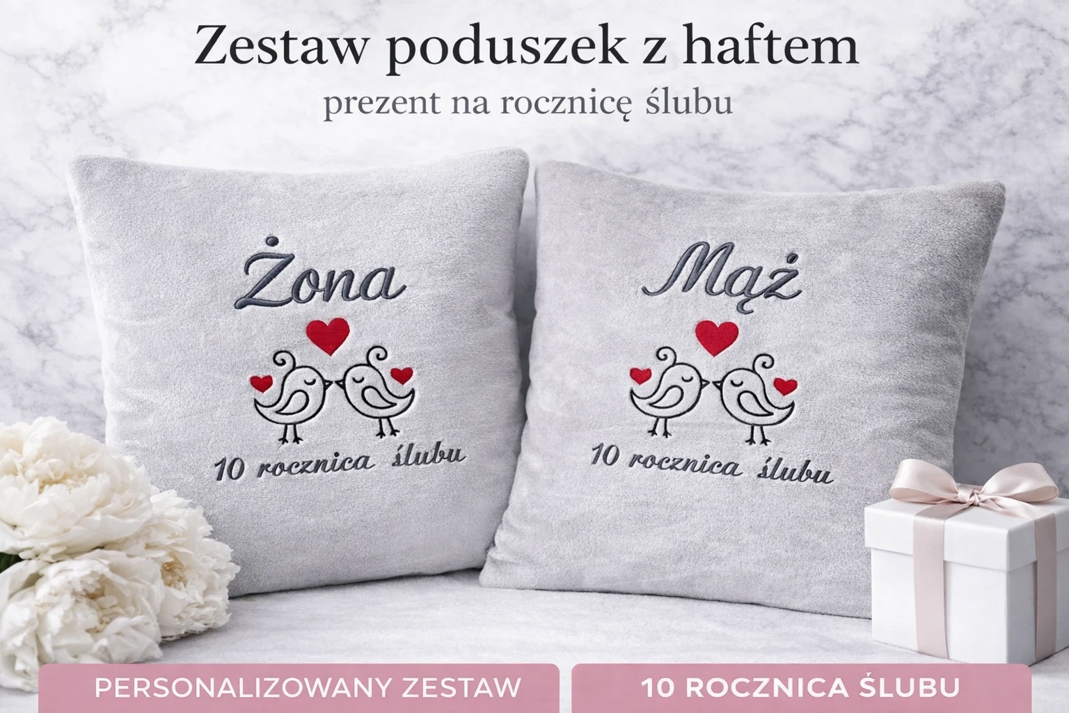 Szukasz wyjątkowego prezentu na rocznicę ślubu? Ten zestaw 2 miękkich poduszek z haftem to elegancka i osobista pamiątka dla małżonków. Na jednej poduszce znajduje się napis „Żona”, na drugiej „Mąż”, a całość uzupełnia romantyczny motyw ptaszków i możliwość dopasowania rocznicy ślubu.